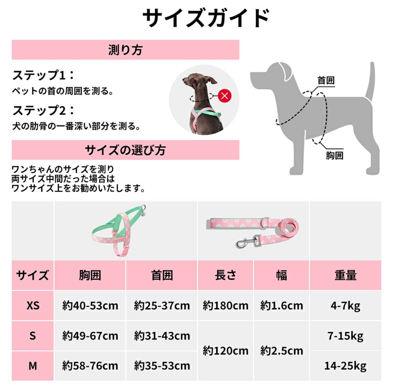 XS:胴輪:40~53 cm、首まわり:25-37cm、リード長さ: 180 cm, リード幅: 1.6 cm