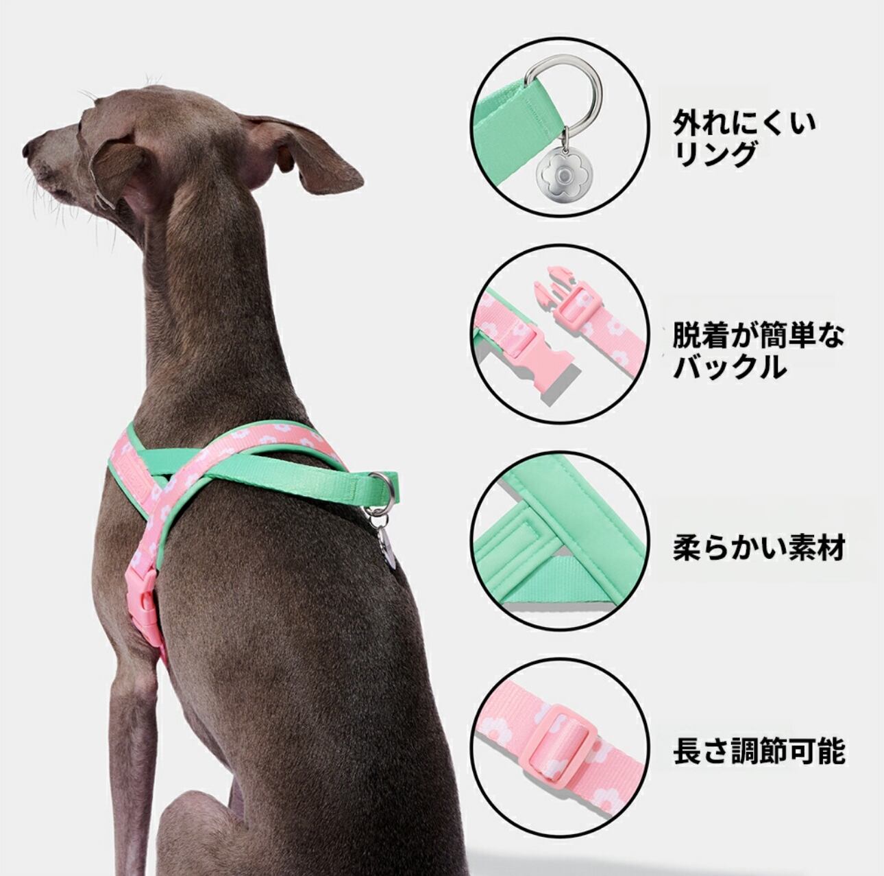 【スタイリッシュなデザイン】このハーネスとリードセットはピンクと緑の色合いで、花のデザインが施されています。長時間抜かず着ても着心地がいいから、彼らの毛皮に優しい拡幅されたネオプレン裏地で快適さも保ちます。