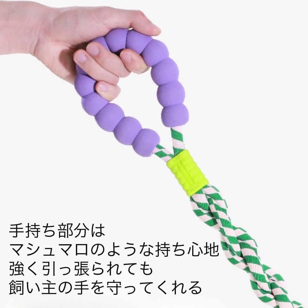 持ち手はぷにっとした手触りでやわらかく、大きい子がひっぱっても飼い主さんの手が痛くなりにくい。